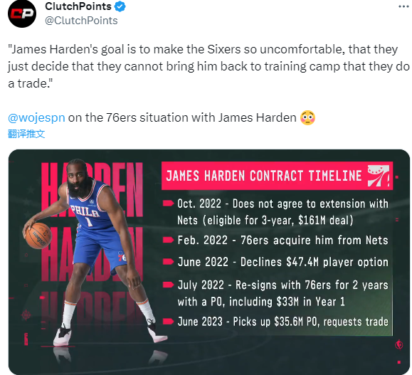 看到76人不再交易自己的新闻,哈登正式与76人高管撕破脸,此举旨在逼宫球队继续交易自己;名记woj表示:哈登的目标就是让76人感到不爽,让他们意识到无法将自己带回训练营,从而继续进行交易。