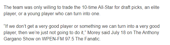 据76人记者Keith Pompey报道,76人队只想用哈登换取选秀权、一名精英球员或者一名能够成为全明星的年轻球员。