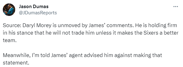 据B/R记者Jason Dumas报道,莫雷对哈登的炮轰无动于衷,莫雷坚持表示,除非能让76人变成一支更好的球队,否则不会交易哈登。