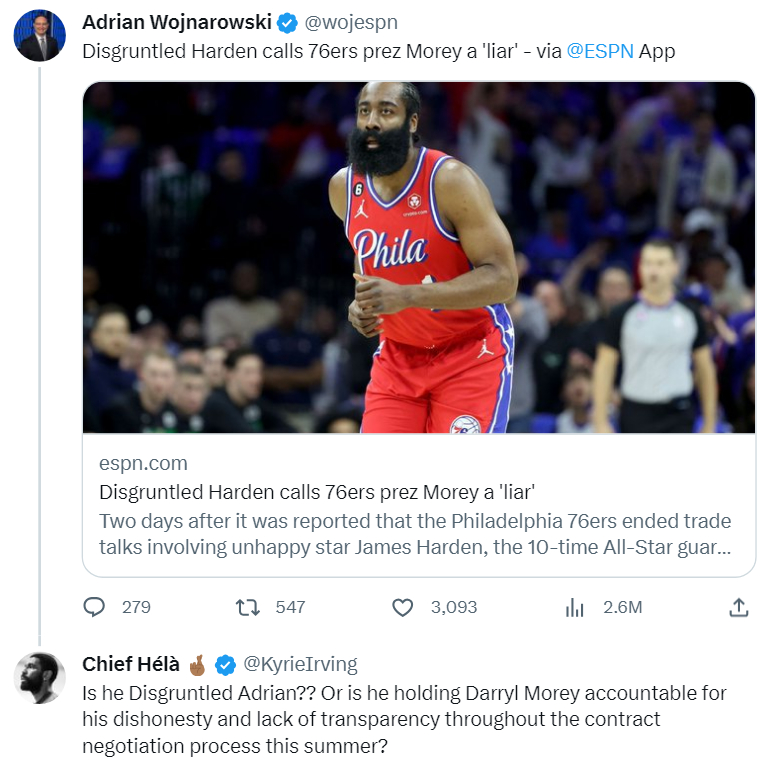 欧文发推询问woj,表示:阿德里安(Woj的姓氏),他是在表达不满吗?还是在追究莫雷在今年夏天合同谈判过程中得不诚实和缺乏透明度的责任呢?