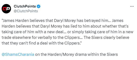 名记Shams最新报道,他表示:哈登认为莫雷背叛了他,他认为后者在和自己签订新的合同方面撒了谎,然后告诉76人自己要去快船。但是,76人显然认为,他们已经无法了快船达成交易了。