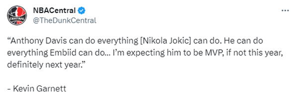 谈到浓眉,加内特在节目中表示:安东尼-戴维斯可以做(尼古拉-约基奇)能做的一切,他可以做恩比德能做的任何事情,我期待他成为MVP,如果不是今年,肯定是明年。