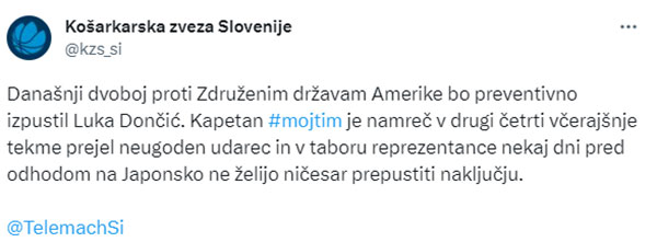 在此前热身赛中,斯洛文尼亚77-99惨败西班牙男篮20分,东契奇得到17分10篮板,比赛期间不幸受伤并且一度离场,所幸伤势无无碍重返赛场,赛后斯洛文尼亚主帅塞库利奇谈到东契奇的伤势,表示:计划是让东契奇出战对阵美国男篮的比赛,但这也取决于他的感受。
