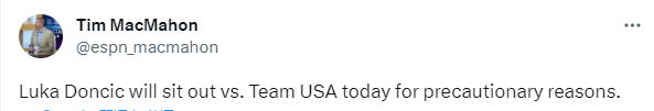 多位名记报道东契奇不会参加与美国男篮的热身赛,斯洛文尼亚篮协表示东契奇在上一场与西班牙的热身赛下半场遭遇不利的打击,处于预防而选择缺席比赛。