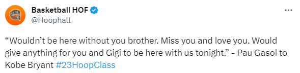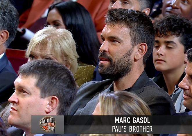 在今年名人堂入堂典礼上,托尼-帕克是第一个发表演讲的球员,加索尔是第四个上台演讲的,湖人总经理佩林卡、科比遗孀瓦妮莎以及小加索尔及其家人都来到现场。