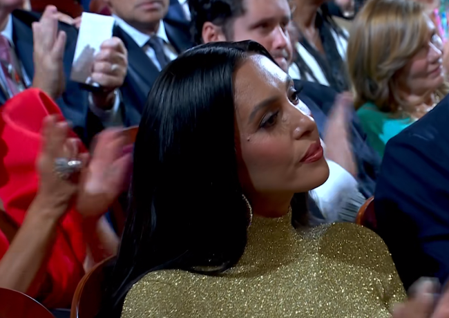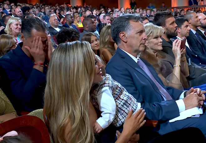 感谢科比期间加索尔用了一连串第三昵称,最后才说出科比的名字,之后加索尔感谢瓦妮莎,后者送飞吻。