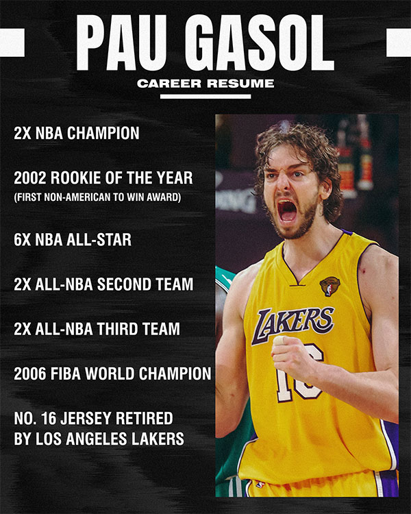 加索尔是2001年首轮3号秀,19年生涯先后为灰熊、湖人、公牛、马刺、雄鹿和开拓者效力,出战1226场常规赛,场均拿到17分9.2篮板3.2助攻1.6盖帽;生涯荣誉方面,加索尔2次夺得总冠军,6次入选全明星,4次最佳阵容,夺得年度最佳新秀,2006年夺得FIBA世界冠军,3次夺得奥运奖牌。
