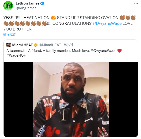 詹姆斯转发了热火官推发布的包括他在内的众人为即将入选名人堂的韦德录制的祝贺视频,配文写道:太棒啦!热火国度。请站起来!起立鼓掌!!!祝贺@韦德 爱你,兄弟。