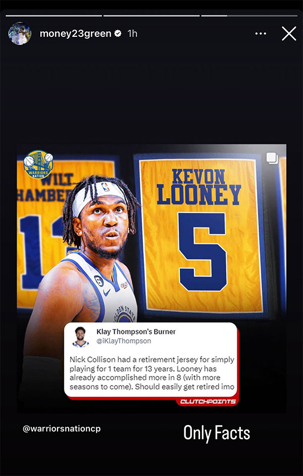 美媒表示尼克-科里森因13年仅仅效力一支球队,他的球衣被雷霆退役;卢尼在勇士的8年已经完成了很多,他的球衣应该退役;追梦格林转发这条动态并且配文写道:只有事实(Only facts)!