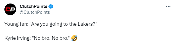 众所周知,不管是篮网时期欧文申请离队还是独行侠时期成为自由球员,外界都传出很多湖人想要引援欧文的流言,外界更传出詹姆斯想要与欧文重聚的流言;尤其是在22-23赛季的交易截止日前,欧文申请离开篮网,湖人主动出击并且提供报价,但篮网不想把欧文送到湖人,最终欧文被交易到独行侠。