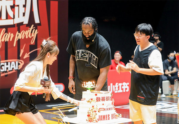 球迷用定制蛋糕为哈登庆生,蛋糕上写着哈登的名字,祝他天天笑哈哈,哈登满脸笑容乐开怀;在活动现场,哈登拥抱每一位上台的球迷并且为他们签名以及合影留念。