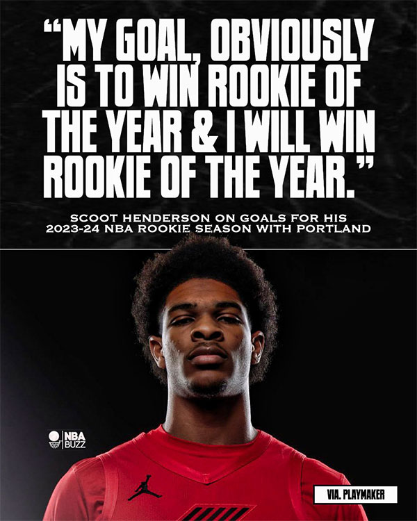 在2023年NBA选秀大会上,亨德森被开拓者用3号签选中,成为仅次于文班亚马(马刺状元)和布兰登-米勒(黄蜂榜眼)的探花秀;不把状元和榜眼放在眼里吗?亨德森公开豪言以及承诺,他将赢得年度最佳新秀。