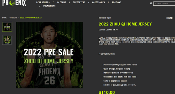 值得一提的是周琦在新东家的战袍价格并不便宜,售价110澳元,约合人民币523元。相比起CBA的战袍,周琦的新战袍价格确实不菲,当然联想到周琦在国内还是很有影响力的,也是当打之年的国手,不论是通过赛场上的表现还是参加综艺节目,拥有很多的粉丝,所以新款战袍的销量还是很好的。尤其是墨尔本地区的华人是很多的,周琦去到之后,球衣销量和上座率都会有保障的。