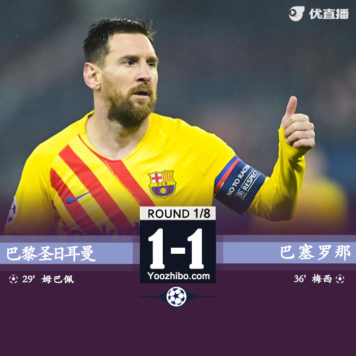 巴黎1-1巴萨进八强 姆巴佩点射梅西世界波+失点