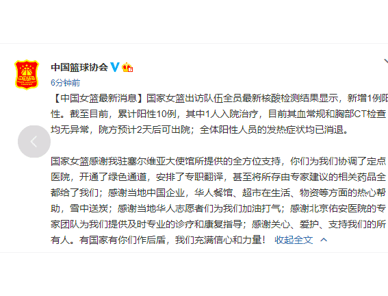 女篮这边的情况,篮协这边的姚明也是迅速的启动预案,为女篮姑娘提供最好的治疗和心理疏导,可是让人意想不到的是,接下来的几天,女篮姑娘这边的情况依旧是不容乐观,在进入隔离期后的再一次检测,女篮姑娘中又增加了7人确诊,2月19日,中国篮协发布最新通告,女篮这边又增加了1名确诊,目前女篮26名成员,有10人确诊,其中还有一人需要住院检查。