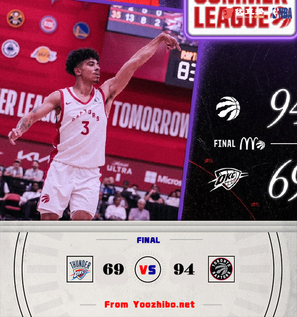 JRS直播网讯 7月14日讯 NBA夏季联赛,雷霆对阵猛龙。开场后猛龙打出10-1的开局,首节雷霆进攻手感不佳,猛龙单节建立起20分优势。第二节两队进攻效率都一般,猛龙没有给雷霆缩小分差的机会。易边再战,雷霆依靠弗拉格勒和琼斯的发挥将分差缩小到10分左右,迪克手感不佳频频打铁,不过第四节猛龙再次将比分拉开,最终猛龙94-69轻松击败雷霆。
