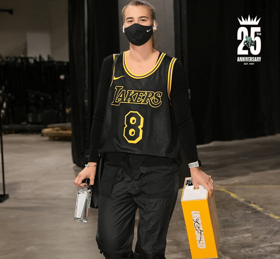 值得一提的是今天萨布里娜入场的时候穿的是湖人8号的黑曼巴战袍,比赛结束之后萨布里娜再度穿上这件球衣,她接受采访的时候致敬科比。
