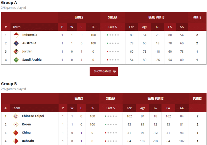 A组中,印尼和澳大利亚首战纷纷大胜,分列前二。但澳大利亚实力超群,小组第一没有悬念。B组中,中国台北和韩国各自取胜,中国和巴林分列3/4位。C组中,日本和伊朗各自取胜分列前二,叙利亚和哈萨克斯坦排名3/4位。D组,新西兰第一黎巴嫩第二,菲律宾第三印度第四。