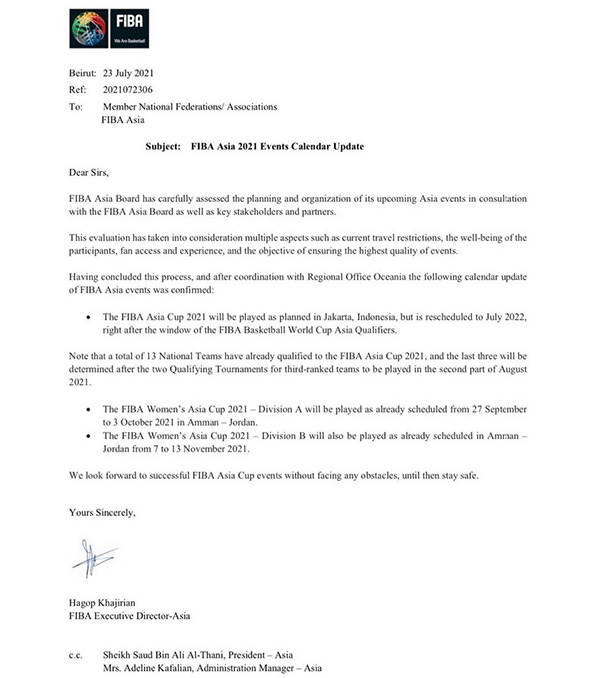 函件中称男篮亚洲杯将改期至2022年7月进行,具体日期并未确定。亚洲杯前的另一项赛事是男篮世界杯亚洲区预选赛的窗口期比赛。