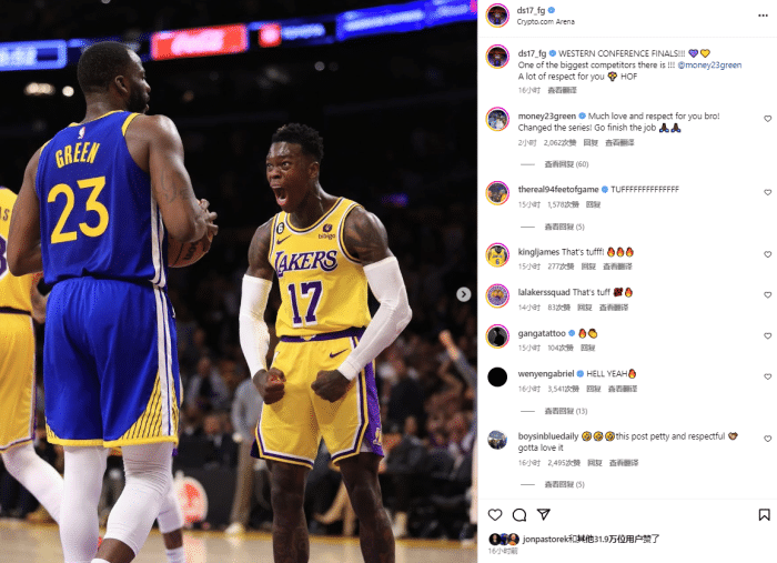 施罗德、拉塞尔等人也更新社媒庆祝晋级西决,施罗德晒怒吼格林照,写道:西决!这人是我最大的竞争对手之一!!@追梦,对你有无限的尊重,名人堂成员。