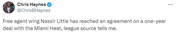 来源:JRS直播网09-24 11:25JRS直播网讯 北京时间9月24日,据名记Chris Haynes的报道,热火已经与自由球员前锋纳西尔-利特尔达成了一份一年合同,成为热火队大名单第15名球员。
