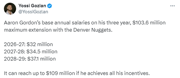 本来25-26赛季可以获得更高的年薪,不过戈登放弃25-5赛季涨薪并且执行原合同最后一年球员选项,薪资专家Yossi Gozlan报道,新签的3年顶薪合同细节——26-27赛季年薪3200万美元,27-28赛季3450万美元和28-29赛季3710万美元,如果他实现所有激励措施,这一数字最高可达1.09亿美元。