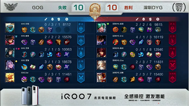 双方和平开局。1分钟中路河道之灵团战,狄仁杰拿下一血,深圳DYG打出0换2。2分20秒镜拿下暴君。2分50秒深圳DYG入侵野区,团战GOG打出0换2。4分08秒橘右京拿下主宰。6分30秒镜推掉上路一塔。7分02秒镜拿下暴君。7分50秒狄仁杰推掉下路一塔。9分40秒狄仁杰推掉下路二塔。9分50秒橘右京推掉上路一塔。10分17秒橘右京拿下主宰。12分05秒不知火舞被击杀。12分17秒黄忠推掉中路一塔。13分10秒狄仁杰推掉中路一塔。13分32秒橘右京拿下暴君。13分45秒野区团战,双方1换1。14分30秒橘右京拿下主宰。14分50秒太乙真人被击杀。16分05秒下路交火,镜拿下双杀。16分48秒狄仁杰推掉下路高地塔。18分10秒镜抢下暴君。18分45秒河道团战,镜拿下三杀,深圳DYG打出0换4。19分33秒深圳DYG推掉水晶率先拿下一分。