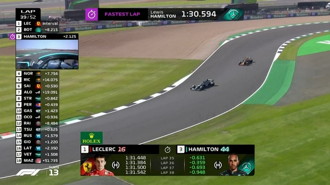 比赛最后10圈中,汉密尔顿连续刷新最快单圈,不断缩小与领跑的勒克莱尔之间的差距,最终,在第49圈,双方都遭遇慢车套圈后,距离来到了DRS区内。第50圈,汉密尔顿成功超越勒克莱尔升至第一,并最终一路领跑到底。另外,比赛最后阶段,第48圈,莱科宁与佩雷兹在第17号弯争抢中发生碰撞,前者赛车滑进缓冲区,引发短暂黄旗,不过好在赛车都未受损,赛会也表示要在赛后对二者进行调查。