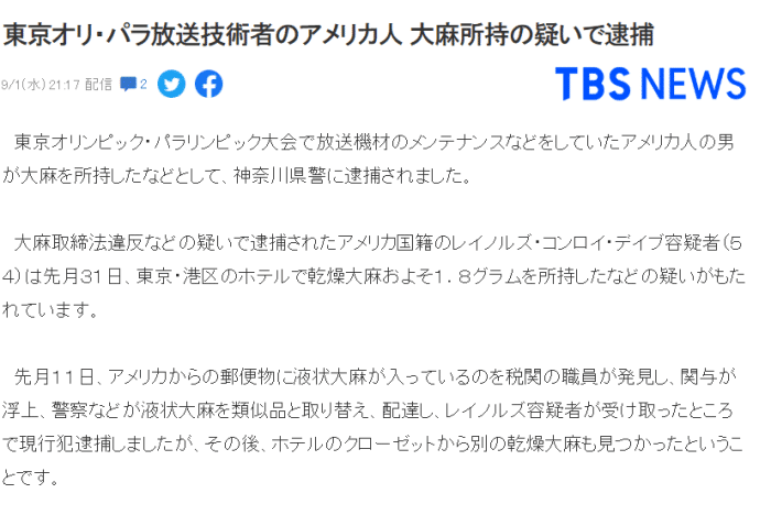 根据日本方面报道,这名媒体人员名为Reynolds Conroy Dave,今年54岁来自美国,和奥林匹克广播公司签订了合同,主要负责媒体报道器械的准备和调试工作。他从4月份便已经来到日本,住在东京的一家酒店里。在8月11日,日本警方缴获了该人士的收件包裹,而里面就藏有大麻。