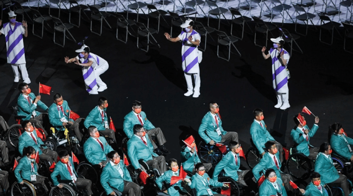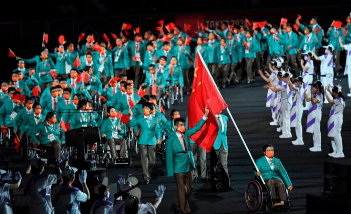 对于国人来说,最高光的时刻毫无疑问就是在北京时间8点左右,中国体育代表团入场,女子射箭运动员周佳敏、男子田径运动员王浩作为双旗手引领中国队进入到体育场。中国代表团由437人组成,其中运动员251人、教练员和工作人员、辅助人员186人。中国代表团将参加20个大项、341个小项的比赛,是我国参加境外残奥会参赛大项最多的一届。