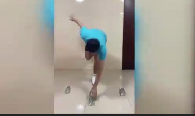 比如说莎莎房间的矿泉水就成为了莎莎的力量训练工具,在视频中,莎莎拿着整箱的矿泉水坐着深蹲。随后,很忙的矿泉水又转换了角色,这下子两箱矿泉水成为了莎莎的压腿工具。