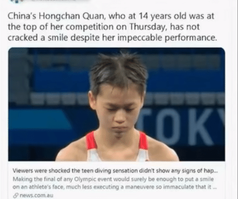 值得一提的是就在人们纷纷赞美全红婵的时候,外媒却刻意抹黑全红婵,也引发了一定的争议。这是澳大利亚的媒体在社交媒体上点评14岁的全红婵,称她夺冠之后没有笑容,用机器人训练等等来进行抹黑,也引发很多人的抨击。