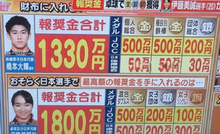 首先是日本奥委会的奖励,金牌500万日元,银牌200万日元,铜牌100万日元,伊藤美诚三个都占了,所以单单是奥委会的奖励就有800万日元。