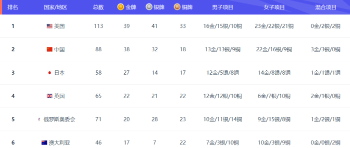 来源:JRS直播网08-08 15:50JRS直播网讯 北京时间8月8日,东京奥运会所有比赛都落下帷幕了,中国体育代表团最终斩获38金32银18铜的成绩单,对比里约奥运会,无论从金牌还是奖牌,都有了明显进步,在比赛日最后一天,美国体育代表团在奖牌榜完成了反超,他们共计得到了39金41银33铜,中国距离奖牌榜首仅差2块金牌。
