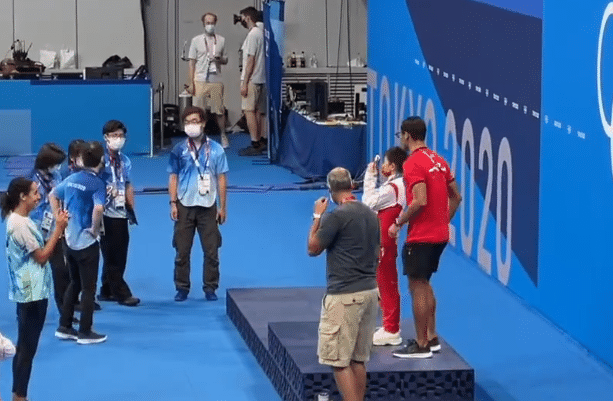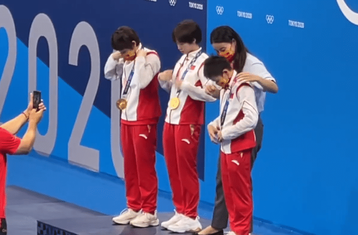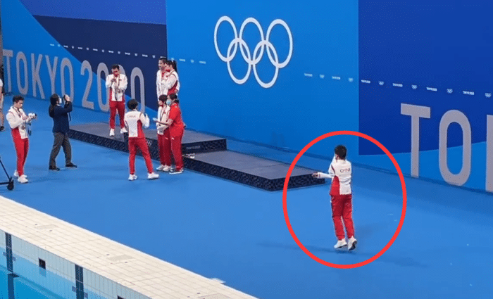 7日是奥运会跳水最后一个比赛日,在比赛结束后,现场开放了领奖台,各国运动员可以在这里进行合影。此时跳水队成员们也争相在领奖台上拍照留念,大家玩得不亦乐乎,这怎么能少了全红婵呢?