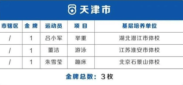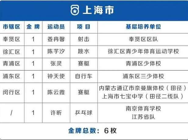 上海6金,其中的代表性人物是国乒的许昕,他拿下1金还有混双的1银。姜冉馨和陈云霞等人也都帮助上海拿下了金牌。