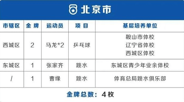 福建的代表性人物是举重的李发斌和李雯雯,都是中国力量的代表。北京代表性人物是拿下乒乓球男单和男团冠军的马龙,张家齐和曹缘也都是跳水的精英,其中曹缘1金1银。
