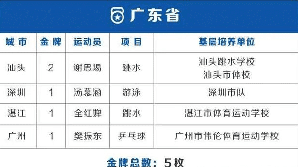 广东的代表性人物是球迷全红婵和樊振东,其中全红婵在女子10米跳台中,14岁的小姑娘3跳满分,破纪录的形势夺冠,樊振东是男单亚军,男团带队夺冠,拿下金牌。