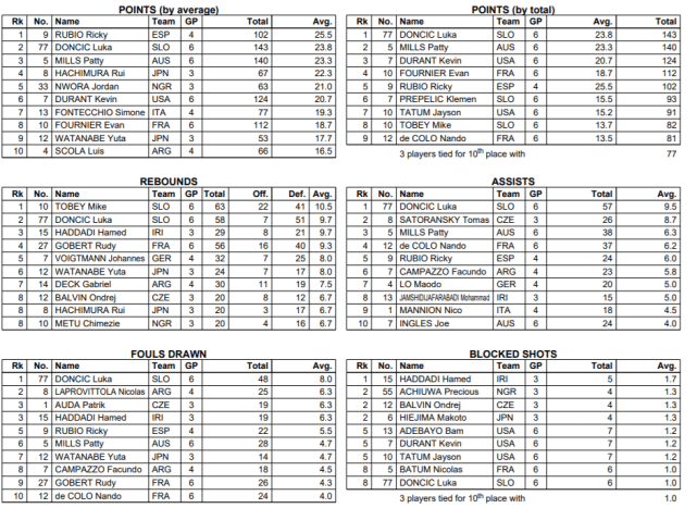 得分榜层面,卢比奥出战4场场均25.5分排名第一,东契奇出战6场场均23.8分排名第二,米尔斯出战6场场均23.3分排名第三。除此之外还有八村垒(奇才)、沃拉(雄鹿)、杜兰特三名球员场均得分超过20分,6名场均得分20+的球员全部是效力于NBA的球员。东契奇赛会总计拿到143分,排名所有球员第一。