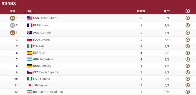 最终12强排名一览(1-12名):美国、法国、澳大利亚、斯洛文尼亚、意大利、西班牙、阿根廷、德国、捷克、尼日利亚、日本、伊朗