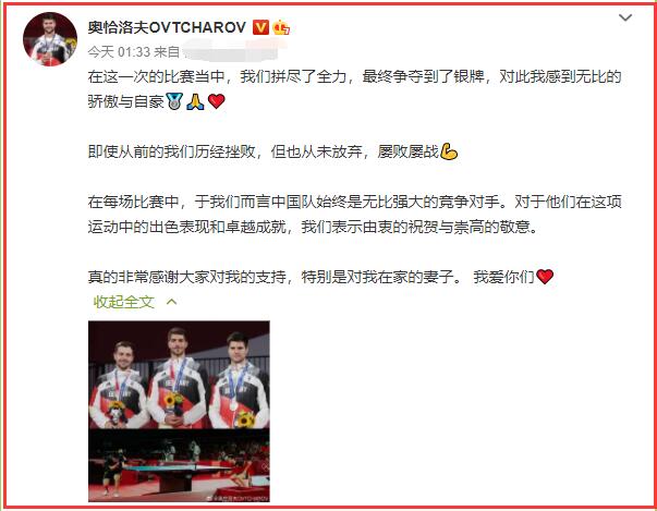 在比赛结束后,收获银牌的奥恰洛夫非常兴奋,他在北京时间凌晨1点33分,东京时间凌晨2点多还没有睡觉,并通过社交媒体发布了一段夺得银牌后的感言,同时还不忘向中国队致敬。
