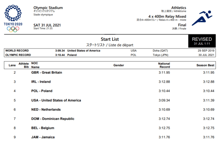 来源:JRS直播网07-31 10:08JRS直播网讯 北京时间7月31日,东京奥运会官网更新了田径4*400米混合接力项目决赛的出场名单。名单显示,美国接力队已经重新进入决赛,而被挤掉的则是德国接力队。这样的结果令很多网友感到不解,因为美国队不但申诉成功,而且不用重赛直接进决赛。网友嘲讽:哄堂大“孝”。