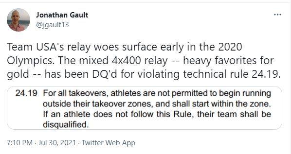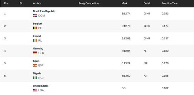 在田径项目4x400米混合接力中,美国田径混合接力队在第1小组出场,作为世界纪录保持者,这本是美国队稳拿的一枚金牌,但由于在接力时站位出现错误,美国队被取消了成绩,从成绩表可以看到,美国队一栏已经显示“DQ”(丧失比赛资格),他们自然也没有资格参加决赛。