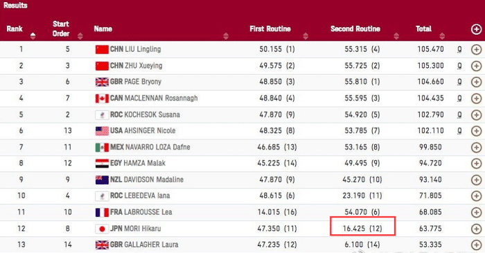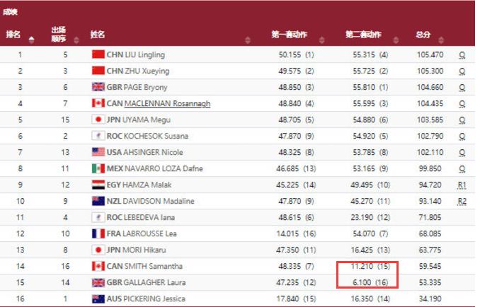 这么多人都有重大失误,那么说谁的分数是最高的呢?翻看下失误之后的成绩对比,英国选手GALLAGHERLaura失误之后这一套动作拿到6.100分,加拿大选手SMITH Samantha失误之后拿到11.210分。而东道主日本选手森光失误的得分是16.425分。