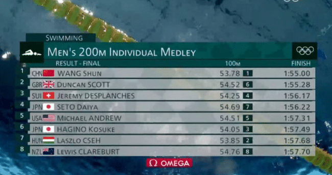 这场比赛汪顺的成绩是1分55秒00第一名,第二名是英国的选手斯科特,他的成绩是1分55秒28。这名选手大家都很熟悉,在前年的世锦赛,他拒绝和夺冠的孙杨握手,并且在赛后大放厥词,公开嘲讽孙杨等等,引发了很大的争议。