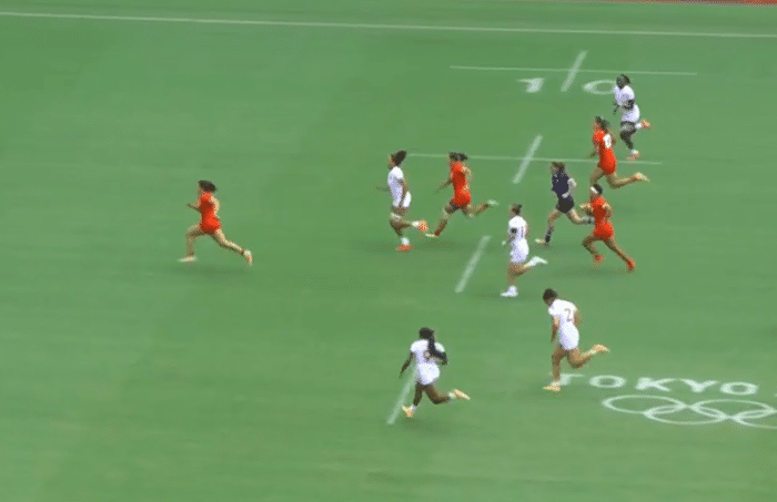 上半场的比赛开始后,中国队打出了精彩的配合,率先完成了第一个达阵,这也是中国队在奥运历史上的首个达阵,中国队这边在压迫的时候出现了失误,美国队也完成了一次达阵,比分变成了7:7,两队回到了同一起跑线,上半场的比赛结束中国队7:7美国队,上半场的比赛中国队的整体表现要比美国队好。