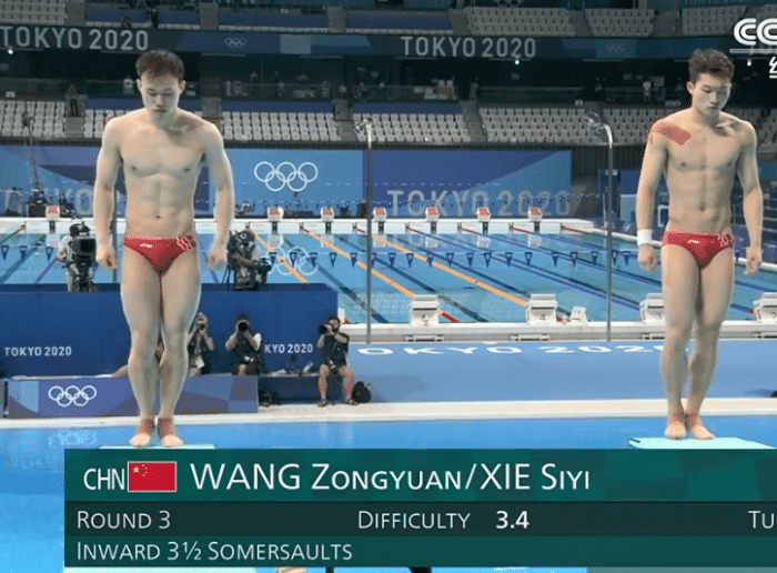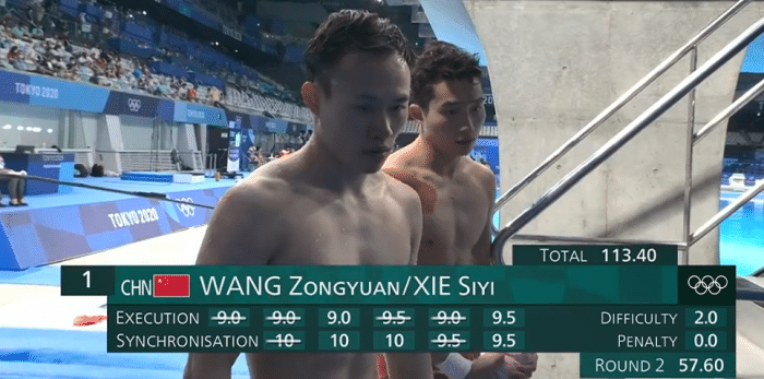 谢思埸是2019年世锦赛的男子三米板单双人冠军,王宗源在2019年世锦赛上拿到一米板的冠军。这次两人一起出战奥运会,在之前的队内选拔赛上,他们的成绩稳定,还创造最好成绩。奥运会决赛的对决,谢思埸和王宗源是第7个出场,总共有8对组合出战,上一届里约奥运会,中国队的曹缘和秦凯只拿到铜牌,这一场王宗源和谢思埸承担重任。