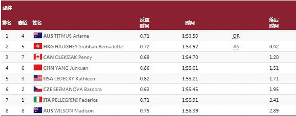 这场决赛的竞争确实非常激烈,其中杨浚瑄反应时间0.66秒,很不错的成绩。前150米,杨浚瑄一直处于第二名,落后第一的中国香港运动员何诗蓓。不过到了最后的50米,蒂特穆斯、奥雷赛科等人开始发力,最终杨浚瑄遗憾的被逆转击败,她和获得铜牌的加拿大奥雷赛科之间仅仅相差了0.31秒。