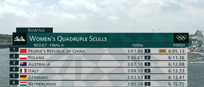 第一个500米,中国女子赛艇队用时1分30秒18,1000米用时3分01秒96,1500米用时4分32秒94,全程2000米用时6分05秒13,创造新的奥运和世界纪录,足足领先第二名多达6秒23,夺冠的优势十分明显;恭喜中国女子赛艇队夺得金牌。
