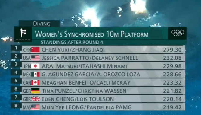 同样因为“炸鱼”付出代价的还有加拿大队,她们的第4跳出现了失误,入水的水花非常大,纵使最后的这一跳加拿大队有不俗的发挥,但依旧以0.64分之差无缘领奖台,获得第四名,这也让她们很遗憾。